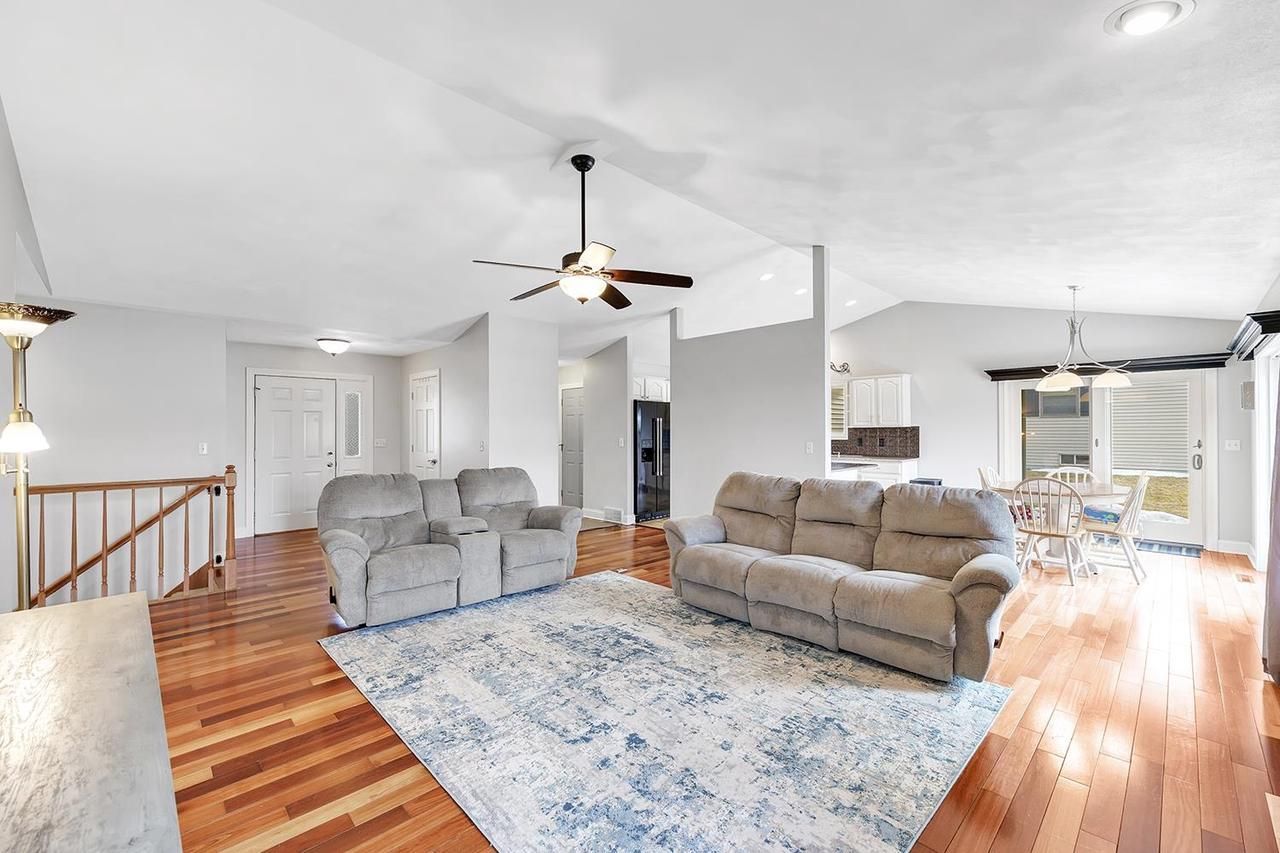 Beautifully maintained ranch home on .33 landscaped acres located on a quiet dead end street close to schools. Open concept listing room w/gleaming hardwood floor, vaulted ceiling & cozy fireplace. Applianced kitchen offers an abundance of staggered top raised panel cabinets, granite countertop, custom tin tile look backsplash & tile floor. Adjoining dining area w/double glass doors to covered & open patio. 1st floor laundry w/utility sink & folding counter + W&D included. Primary bedroom w/crown molding, walk-in closet & private bath. Full LL w/finished family room, 4th bedroom & full bath. Updates incl: roof, siding, furnace, water heater & More! 3+ Car attached garage w/direct basement access. Edge of town location w/close highway access. Assumable mortgage to qualified buyers
